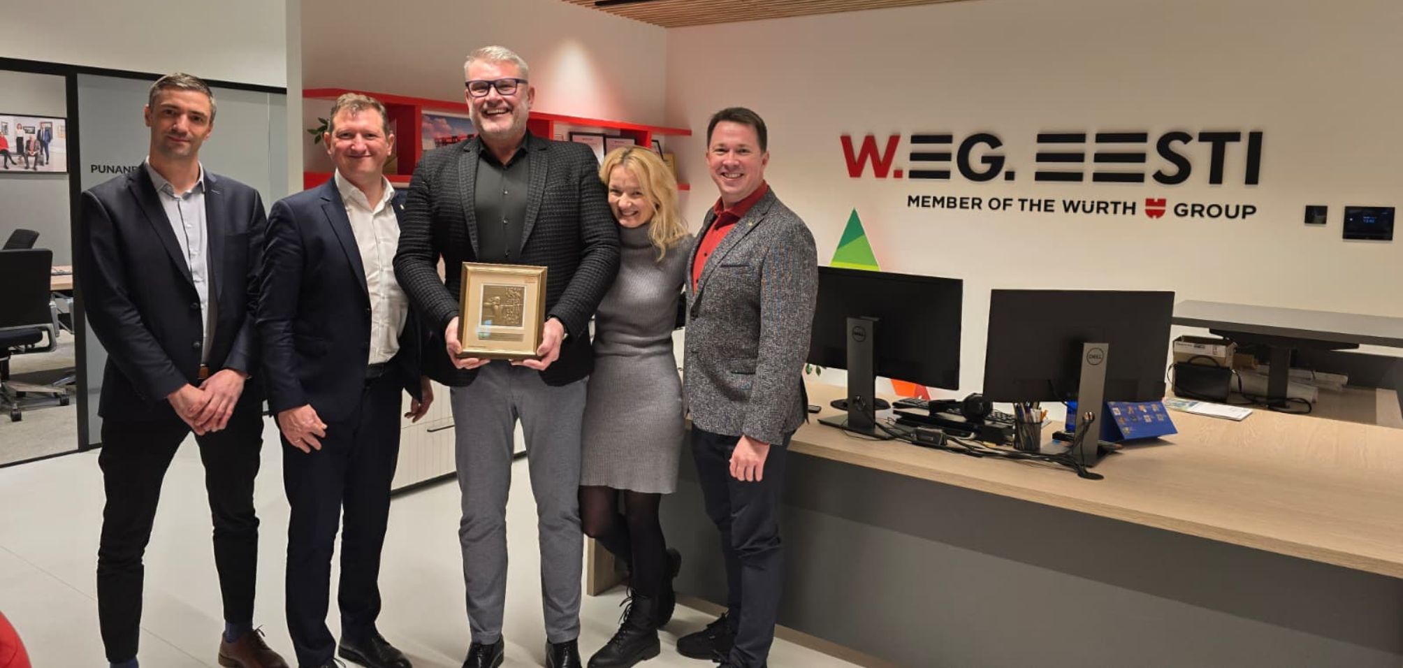 Fotol vasakult: Jürgen Riit (OBO Bettermann Eesti juht), Laimonas Dedūra (OBO Bettermann Baltikumi juht), Timo Raimla (W.EG. Eesti juhatuse esimees, Würth Group Senior Vice President) ja W.EG. Eesti juhatuse liikmed Nele Valkenklau, Silver Aiaste.